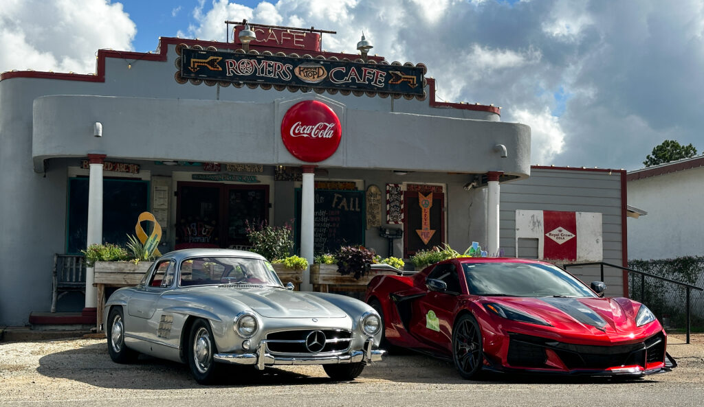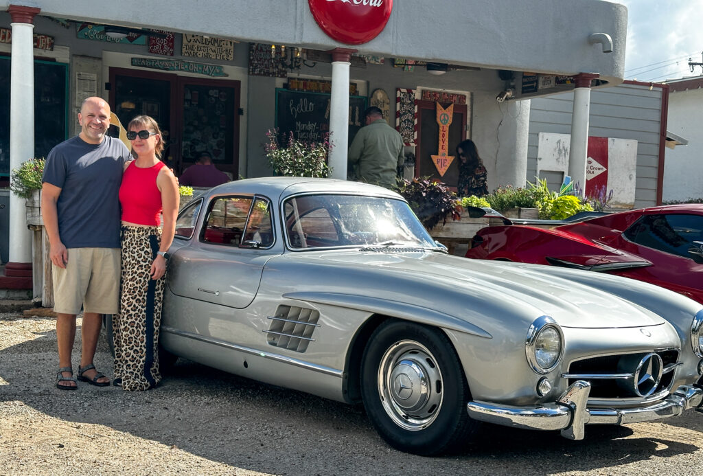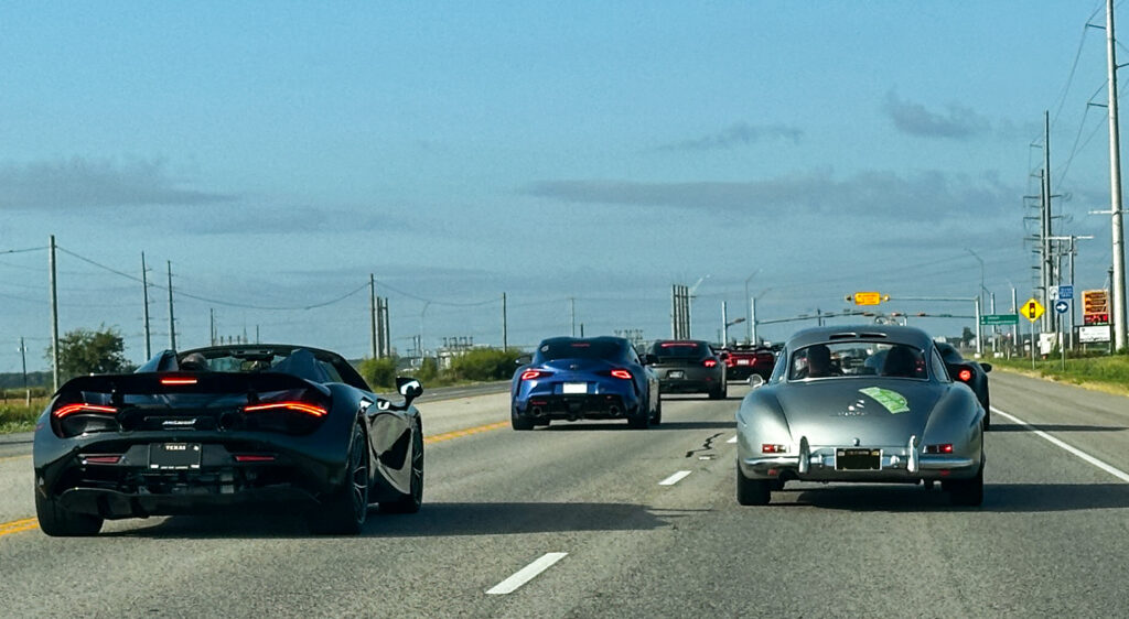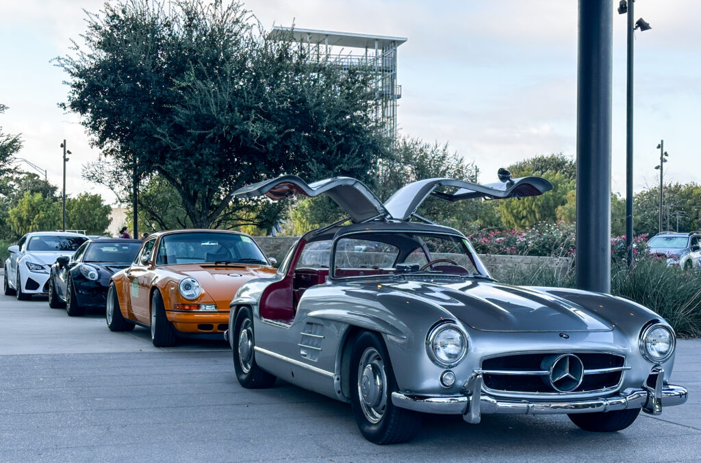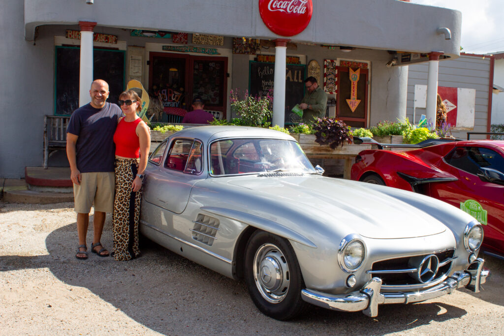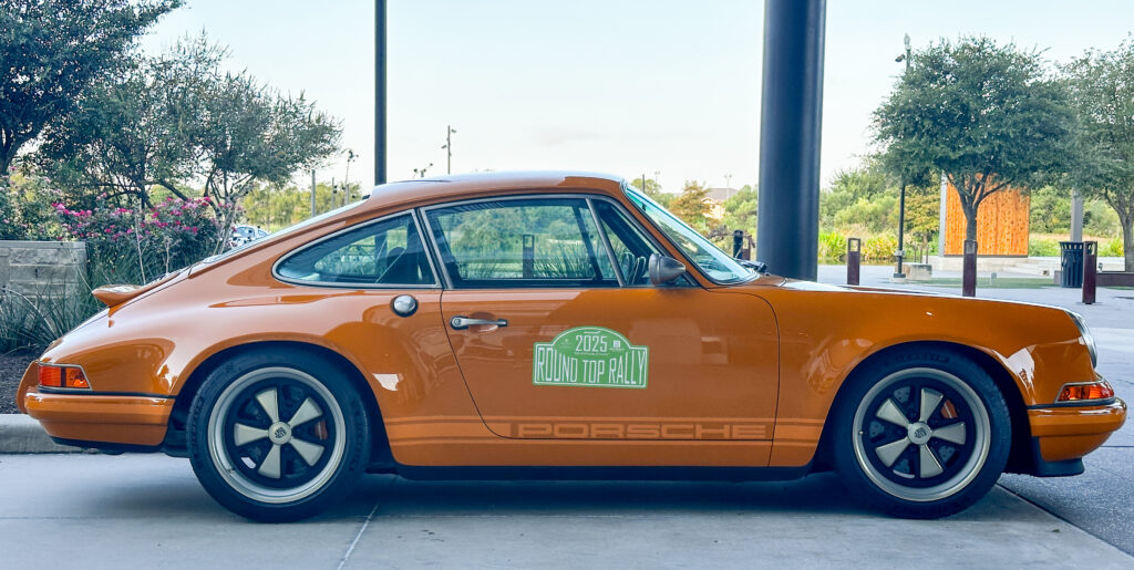 The next morning Jojo and I woke up nice and early and headed back to the Stella Hotel to attend the Round Top Rally.  The Stella Hotel is a great back drop for this event and we were shocked to arrive and see a Mercedes Gullwing parked out front and the Porsche Singer 4.0 from the night before parked out front as well and stickered up for the rally.