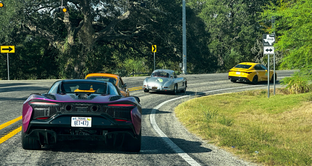 At one point the Mercedes Gullwing had to pull over to check the hood latch and I stopped with him, it was awesome to see that thing scoot back onto the highway.  The route we took has some great sweeping turns and in general scenic landscapes.  Behind the McLaren we were able to see the suspension in action, it was so cool to see it move through the roads we were touring.