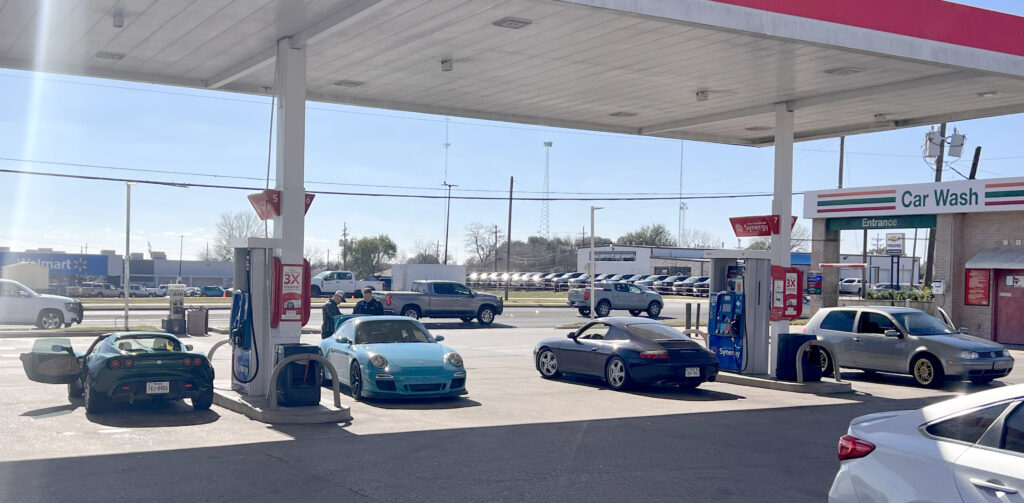 So, after a bit of chatting and checking out each other’s cars, we lined up and headed out for the drive. I got a cool shot of the cars on the highway. As we drove, I got an update that Sam needed gas for his thirsty 911 V8 monster, so we pulled off and we all went ahead and got some petrol. Sadly, as Sam pumped, some coolant began seeping down and didn’t stop, so he and the kids had to drop out of the drive. I didn’t say anything then, but wow I was so excited to see that car in action and just check it out in general. But alas, for another post it seems (we did talk and plan to do one btw)!